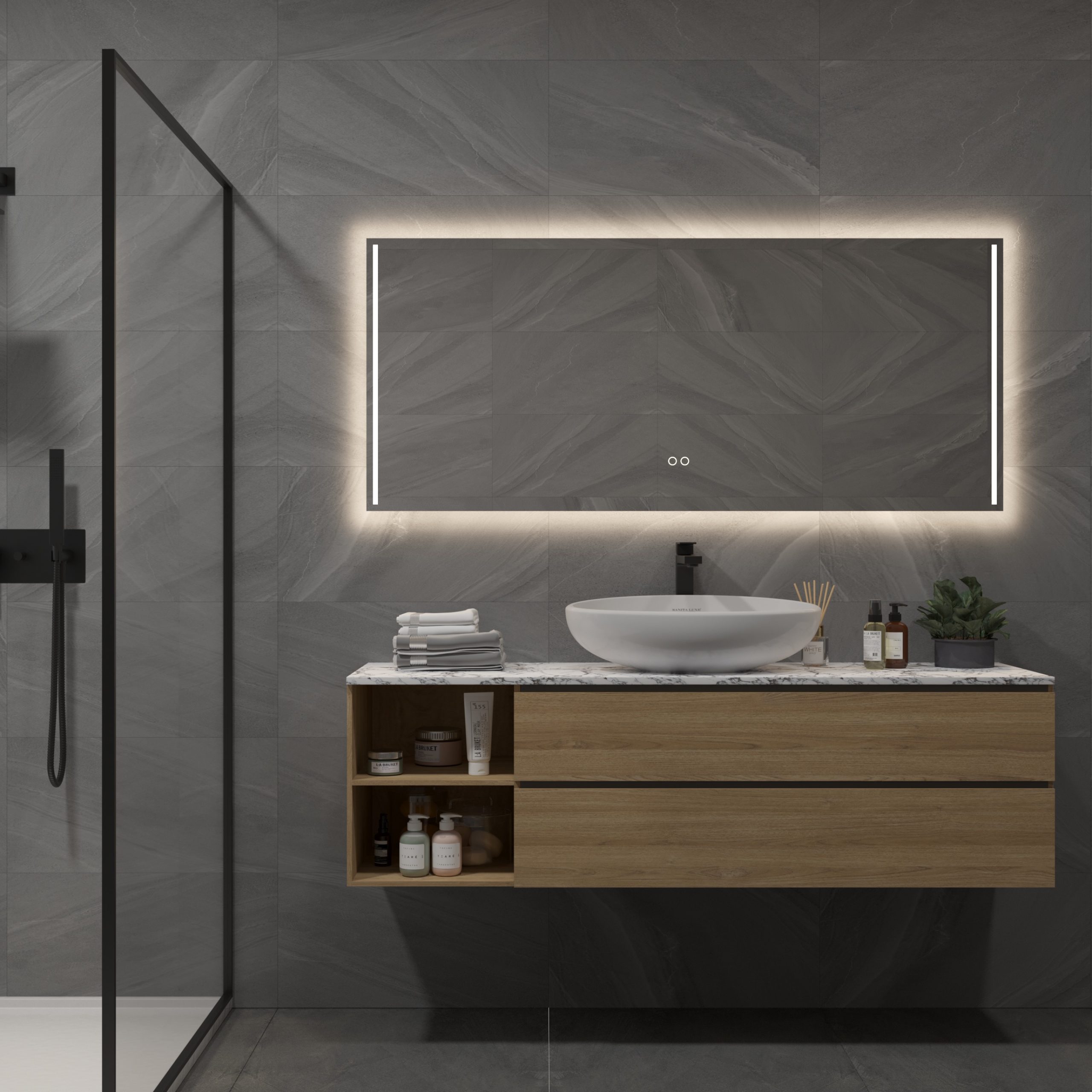 - Inclusief dubbele touch schakelaar in de spiegel, uitgevoerd met kleurenwissel 2700K-6400K en dimfunctie
