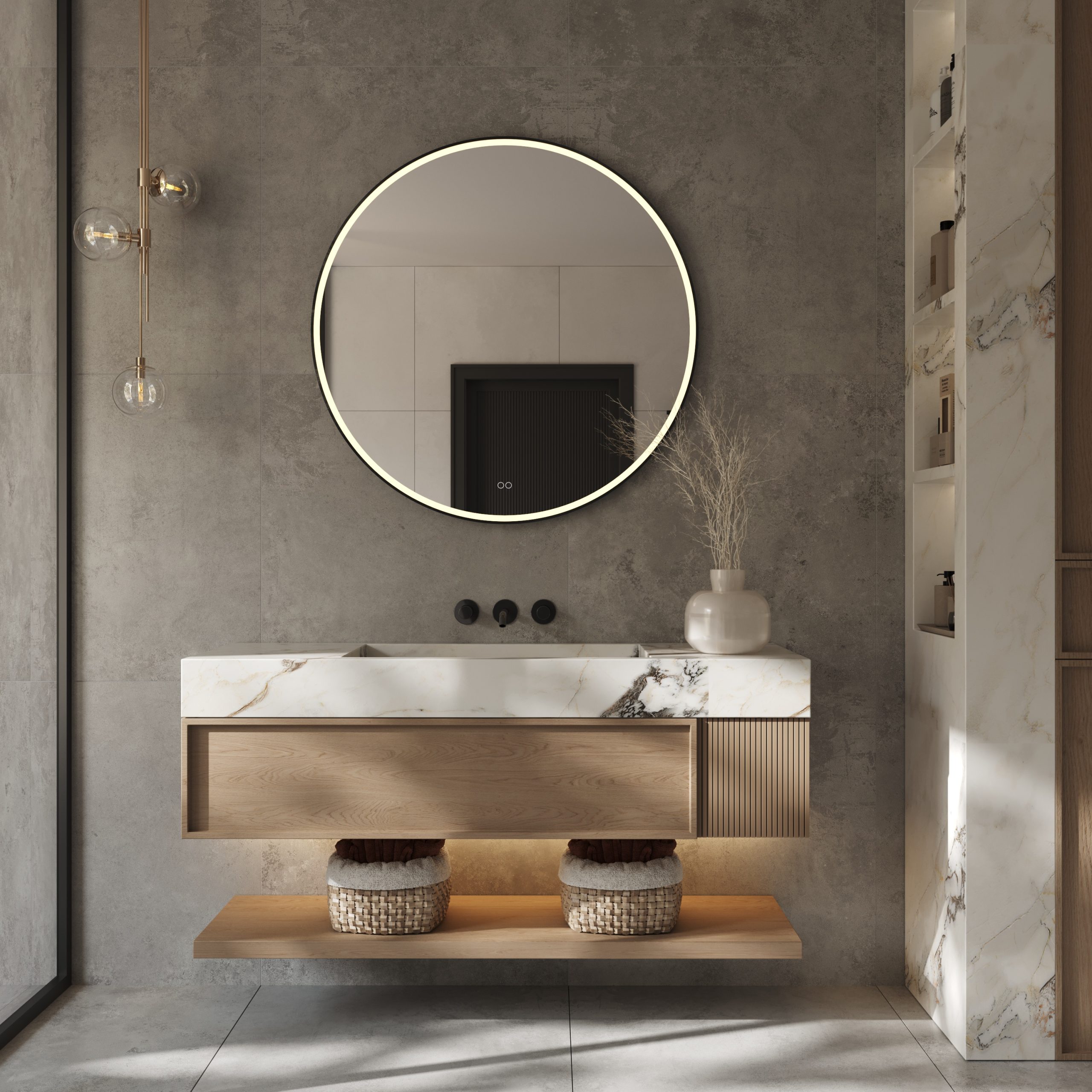 - Inclusief dubbele touch schakelaar in de spiegel, uitgevoerd met kleurenwissel 2700K-6400K en dimfunctie