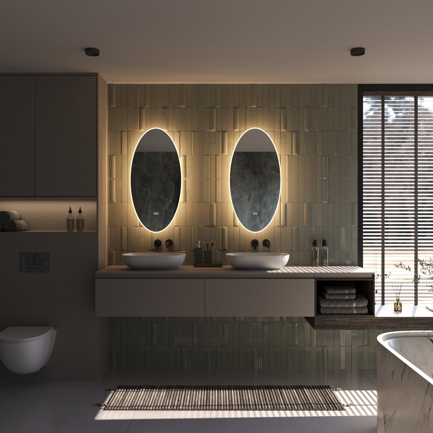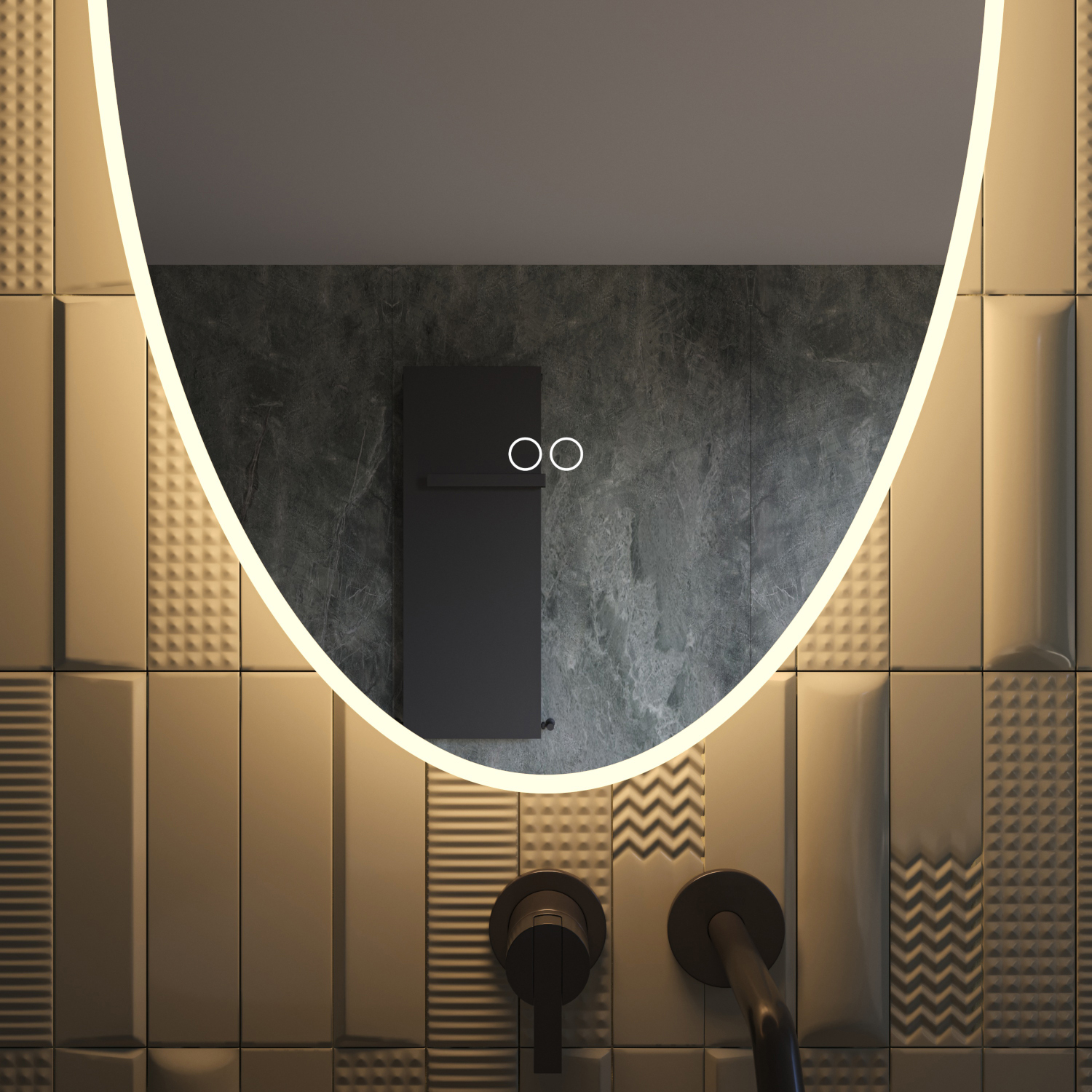 - Verlichting: directe en indirecte verlichting, 24V 120 LEDs/m, schijnt zowel rondom vanachter de spiegel over de wand als naar voren voor praktisch licht in het gezicht, lichtkleur traploos instelbaar van 2700K tot 6400K, dimbaar