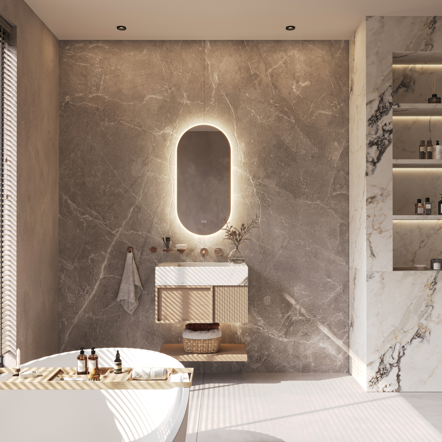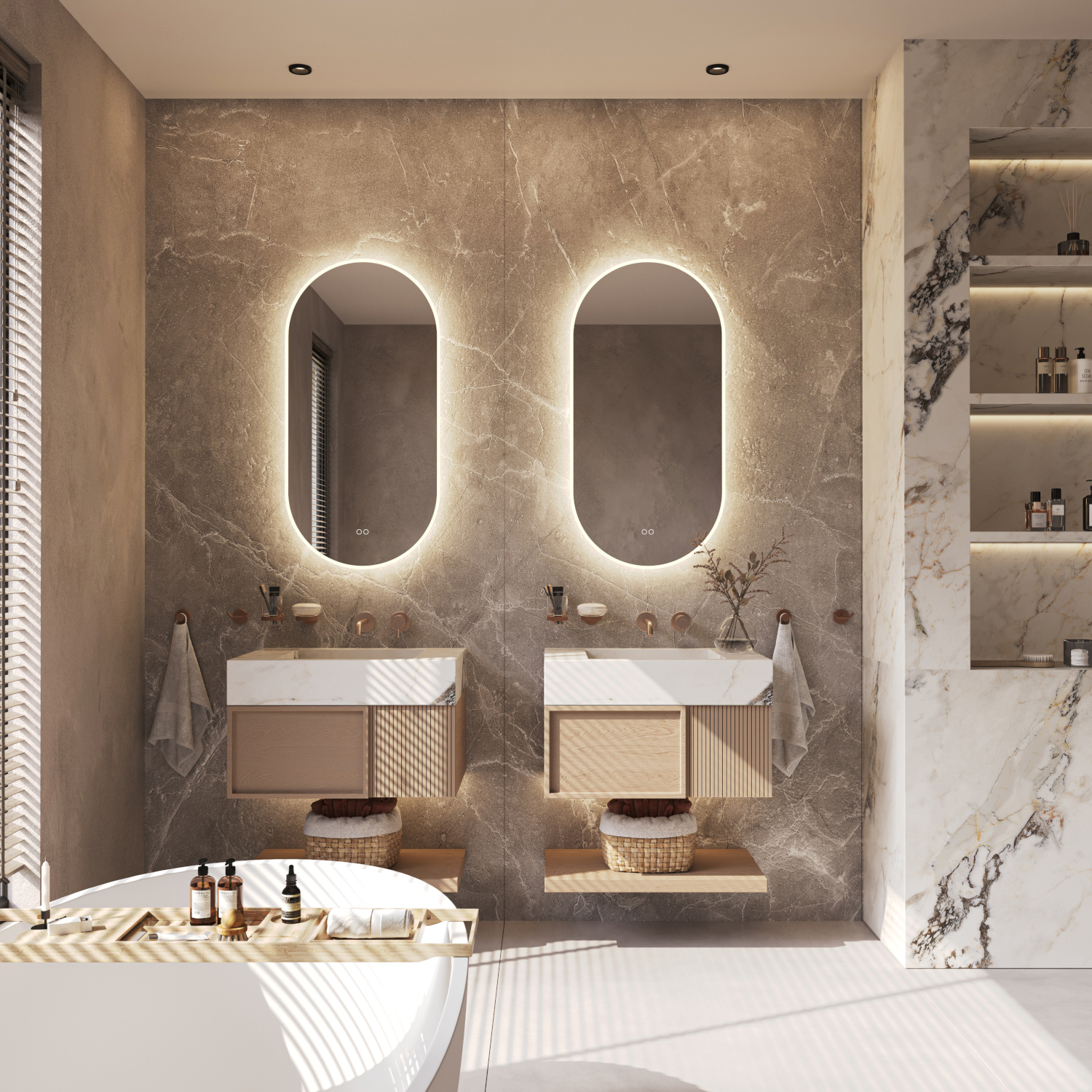 - Inclusief dubbele touch schakelaar in de spiegel, uitgevoerd met kleurenwissel 2700K-6400K en dimfunctie