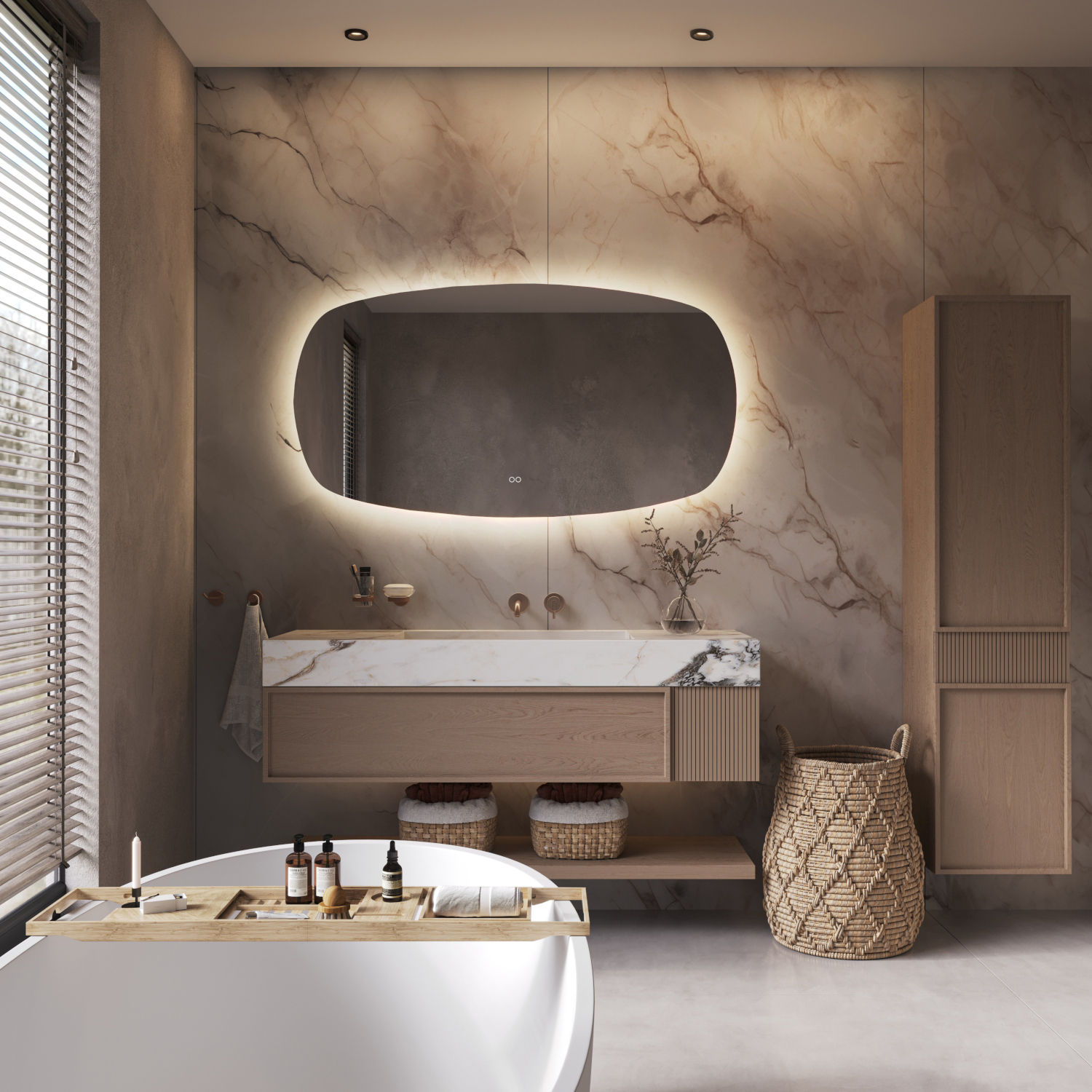 - Verlichting: indirecte verlichting, 24V 120 LEDs/m, schijnt rondom vanachter de spiegel over de wand, lichtkleur traploos instelbaar van 2700K tot 6400K