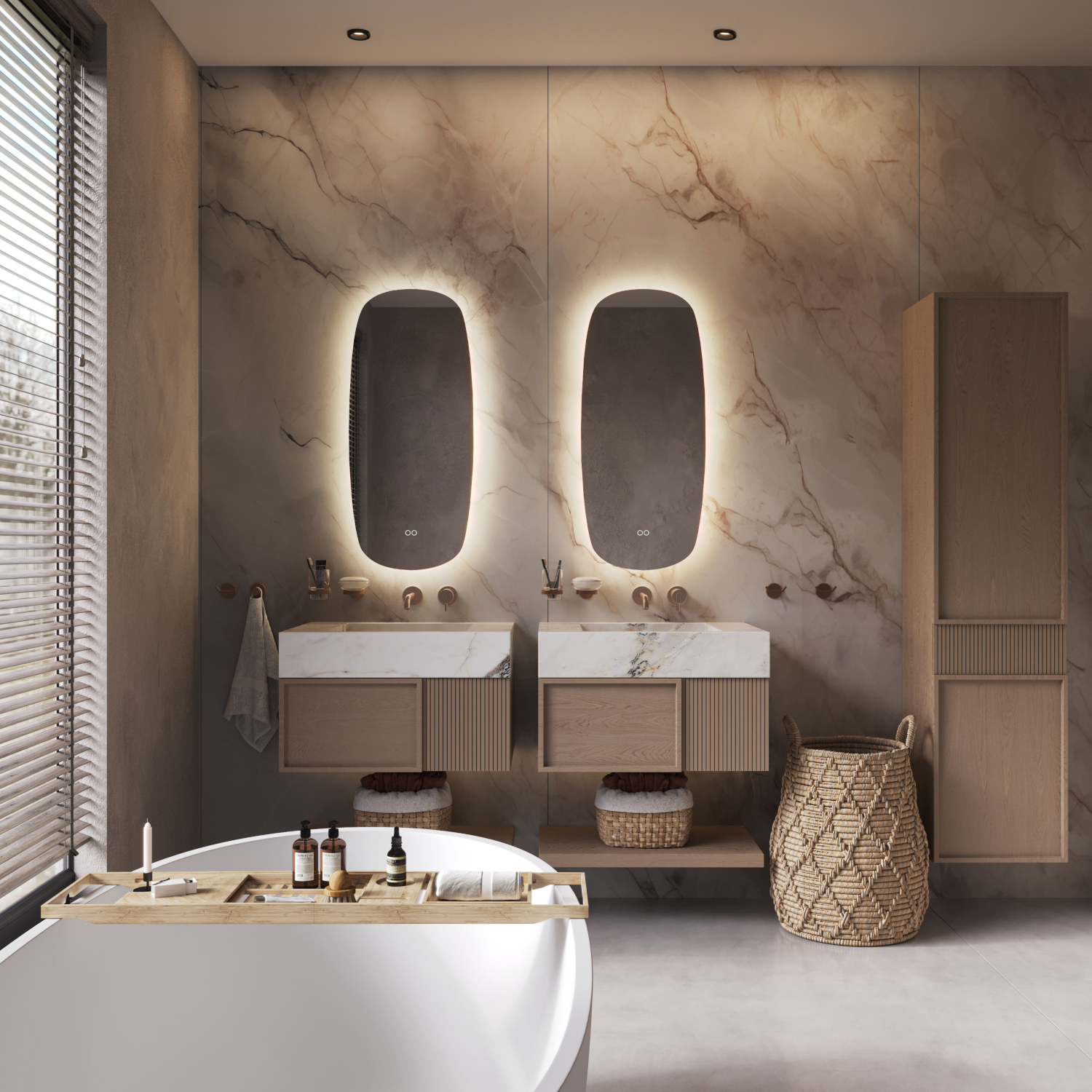 - Verlichting: indirecte verlichting, 24V 120 LEDs/m, schijnt rondom vanachter de spiegel over de wand, lichtkleur instelbaar van 2700K tot 6400K, dimbaar