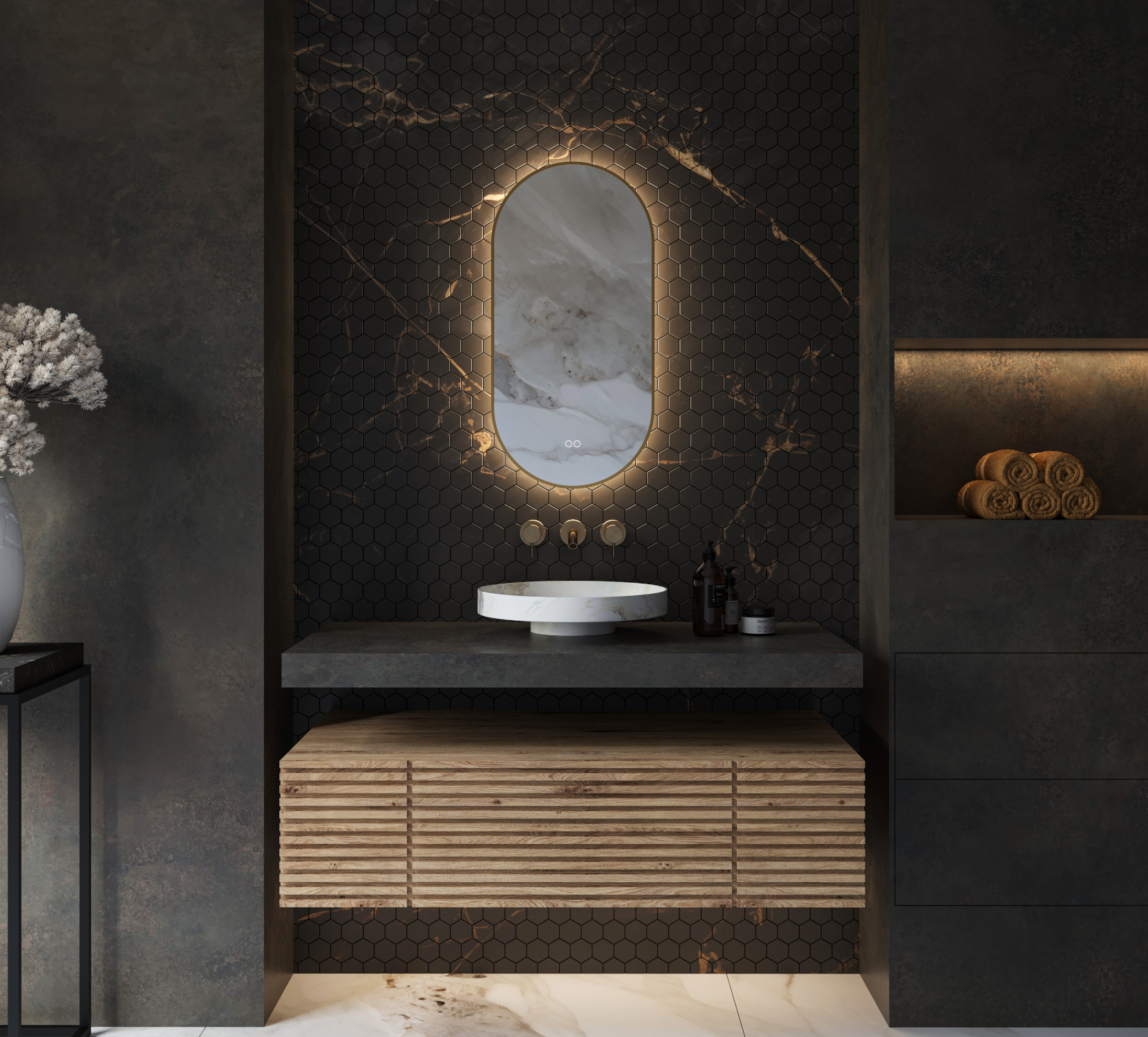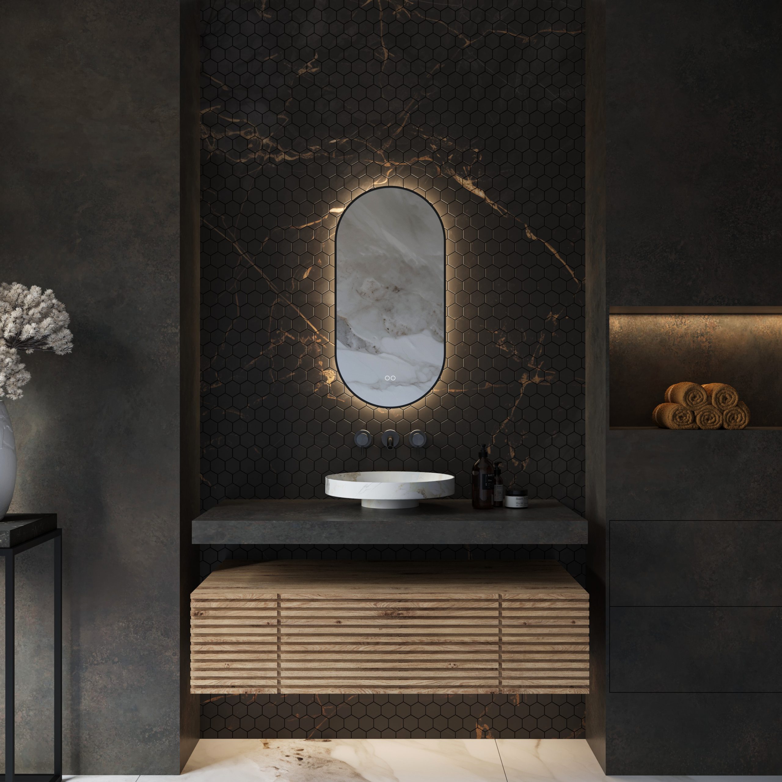 - Inclusief dubbele touch schakelaar in de spiegel, uitgevoerd met kleurenwissel 2700K-6400K en dimfunctie