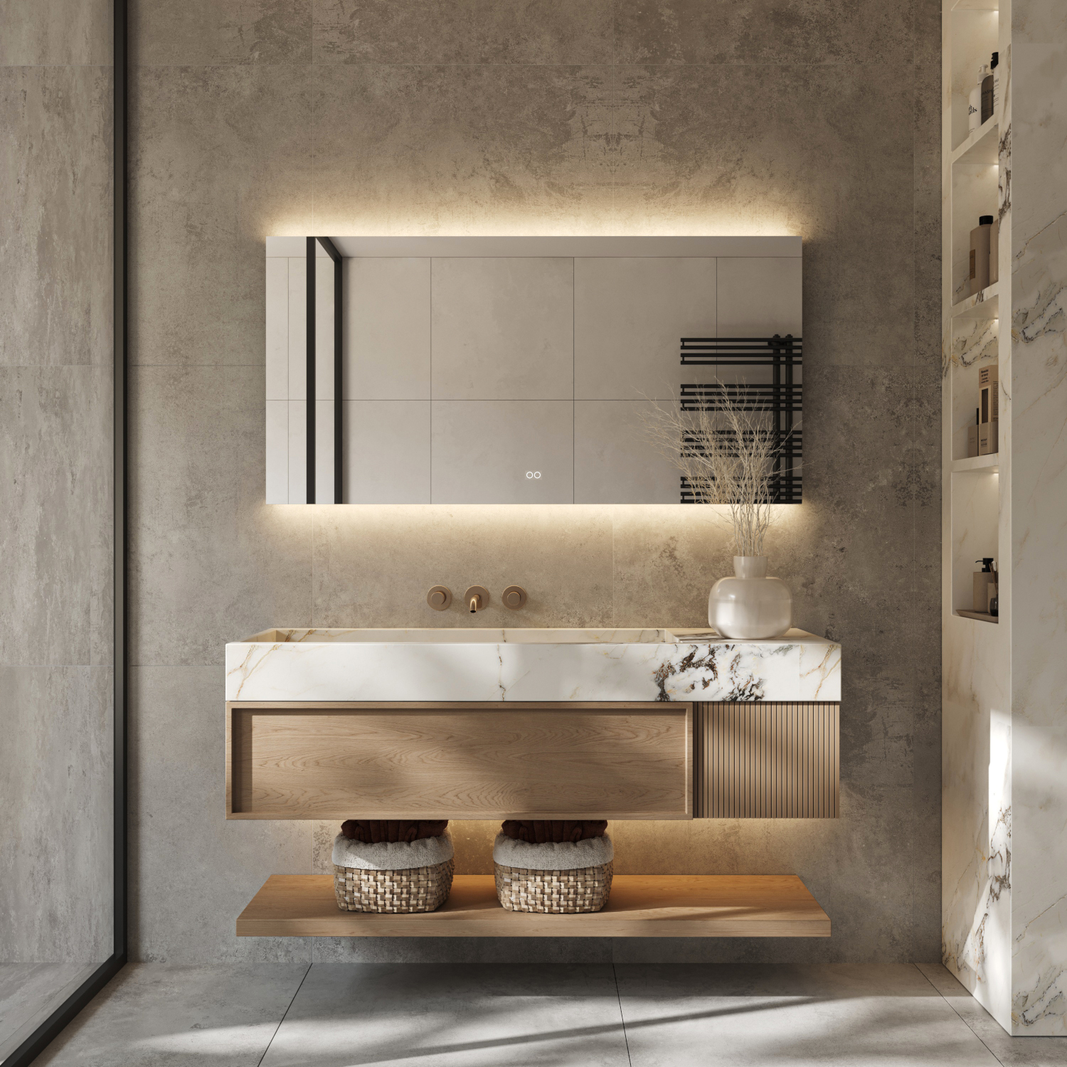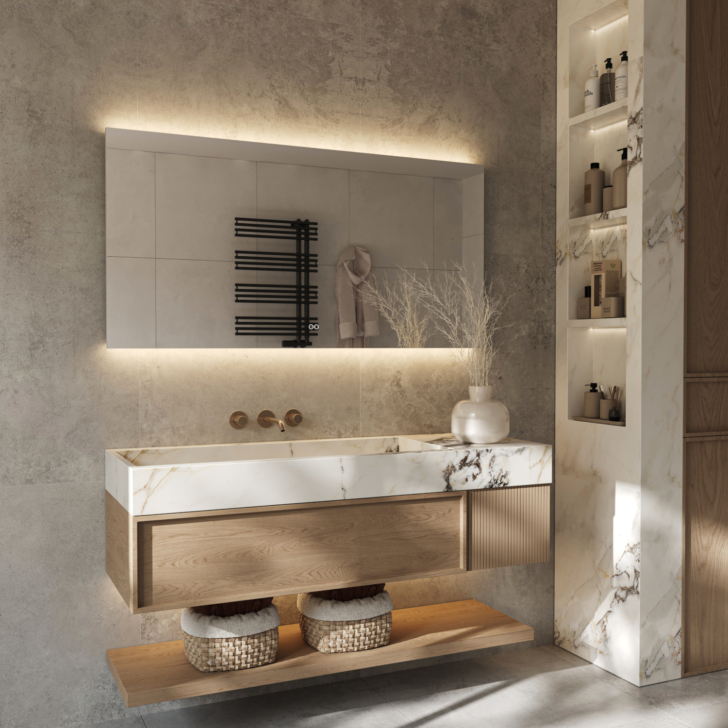 - Verlichting: indirecte verlichting onder en boven, 24V 120 LEDs/m, schijnt vanachter de spiegel over de wand, lichtkleur traploos instelbaar van 2700K tot 6400K