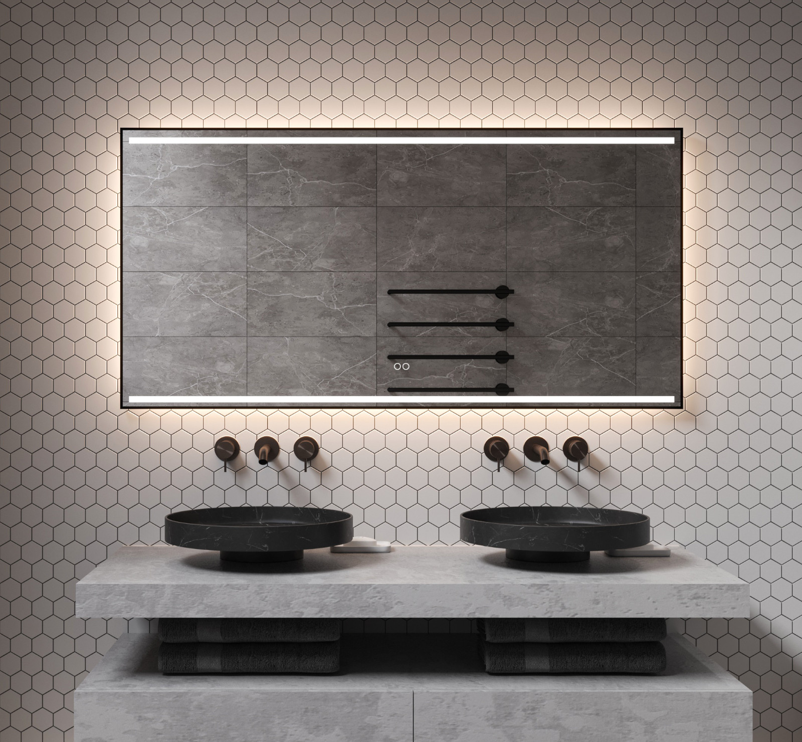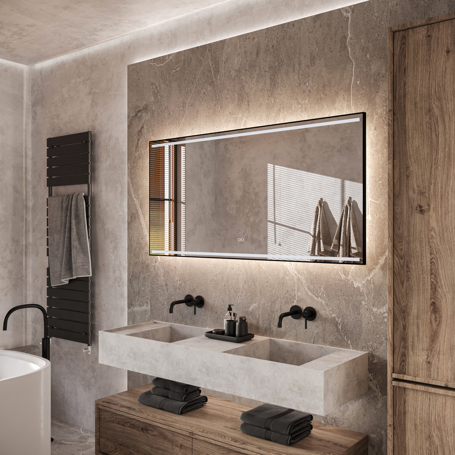 - Inclusief dubbele touch schakelaar in de spiegel, uitgevoerd met kleurenwissel 2700K-6400K en dimfunctie