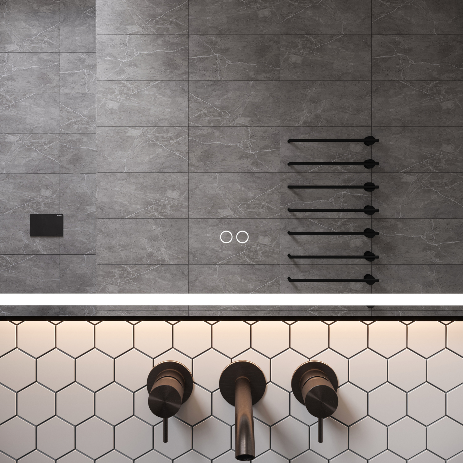 - Verlichting: directe verlichting boven en onder en indirecte verlichting rondom, 24V 120 LEDs/m, lichtkleur traploos instelbaar van 2700K tot 6400K
